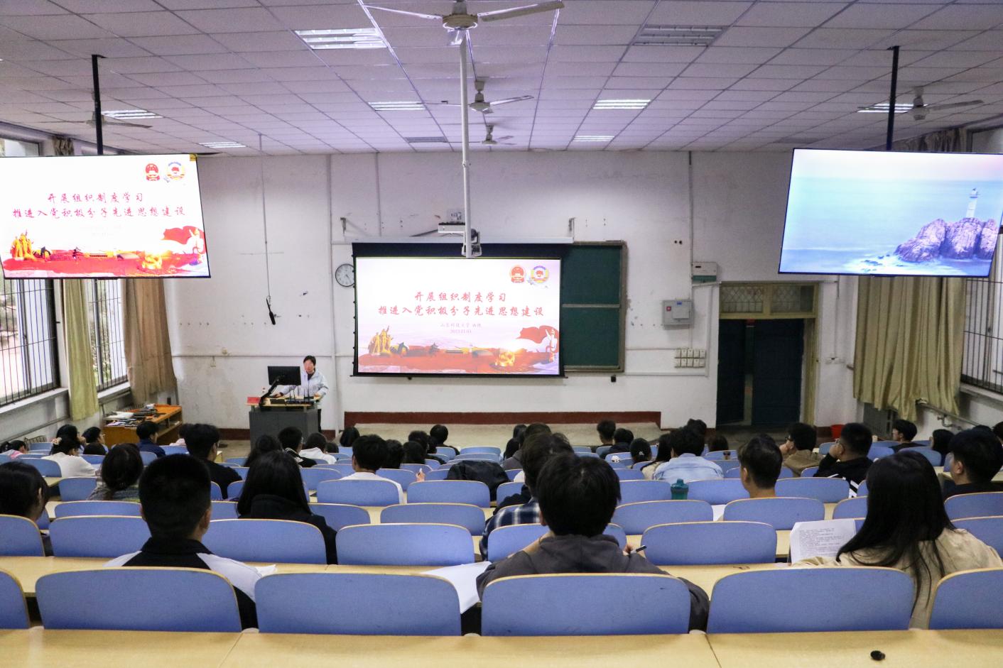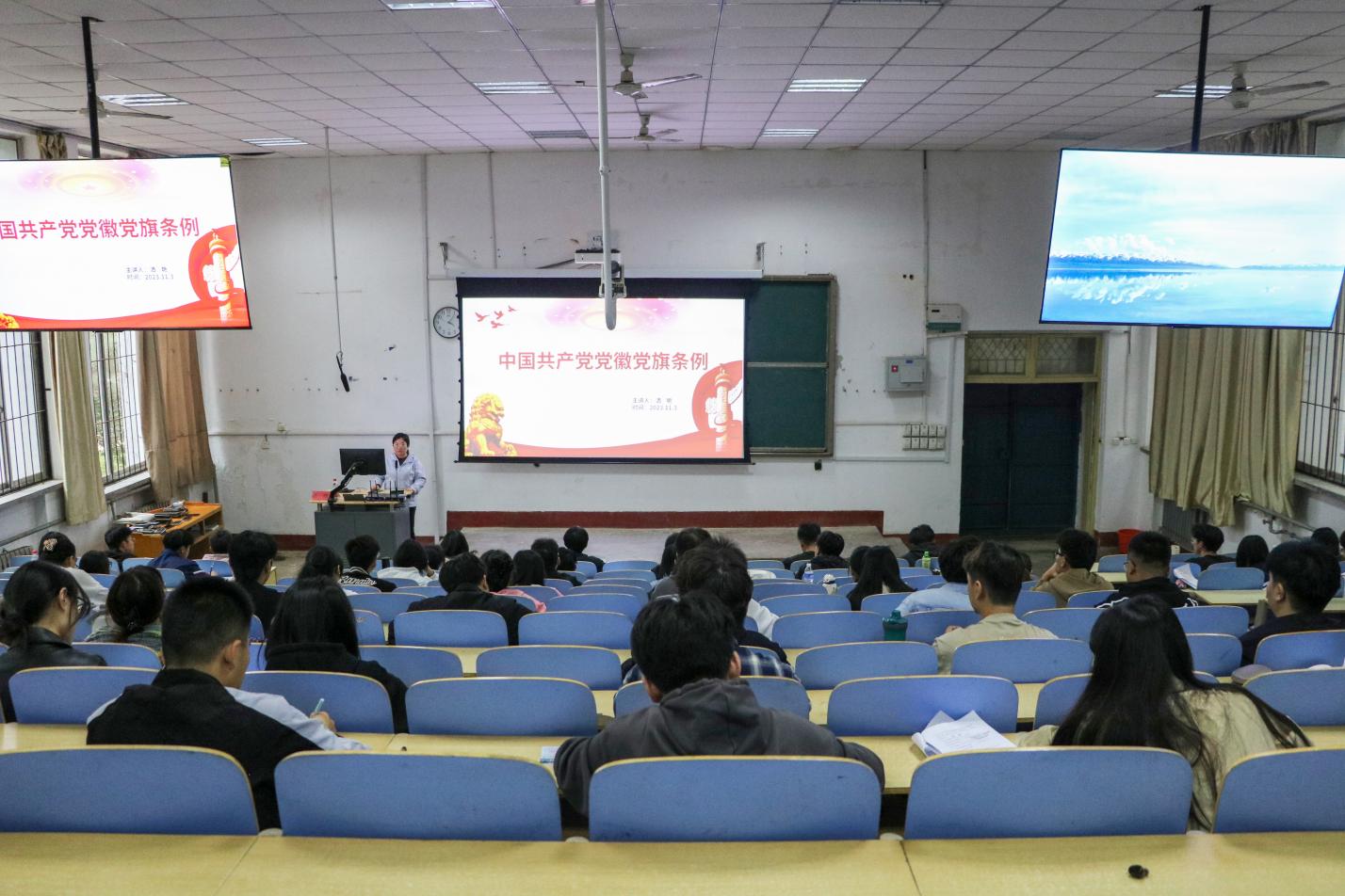 11月3日,365best体育官网登录学工办主任、团委书记、第四党支部书记洒艳在1A107为入党积极分子讲授“中国共产党党徽党旗条例”与“开展组织制度学习推进入党积极分子先进思想建设”专题党课。
