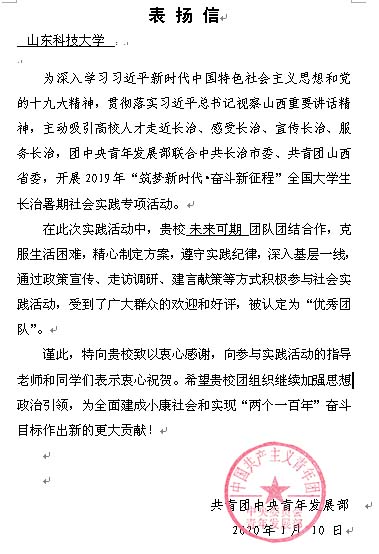 近日,共青团中央青年发展部向公司发来表扬信,表扬365best体育官网登录派出的团队在2019年“筑梦新时代•奋斗新征程”全国老员工长治暑期社会实践专项活动中的优异表现。公司“未来可期”团队(指导教师:商岩冬、尹发利,团队成员:杜文琦、张倩倩、刘森、孙玲、王世朋、刘永康、曹亚利、王世斌)获得优秀团队,365best体育官网登录员工杜文琦获得优秀个人。