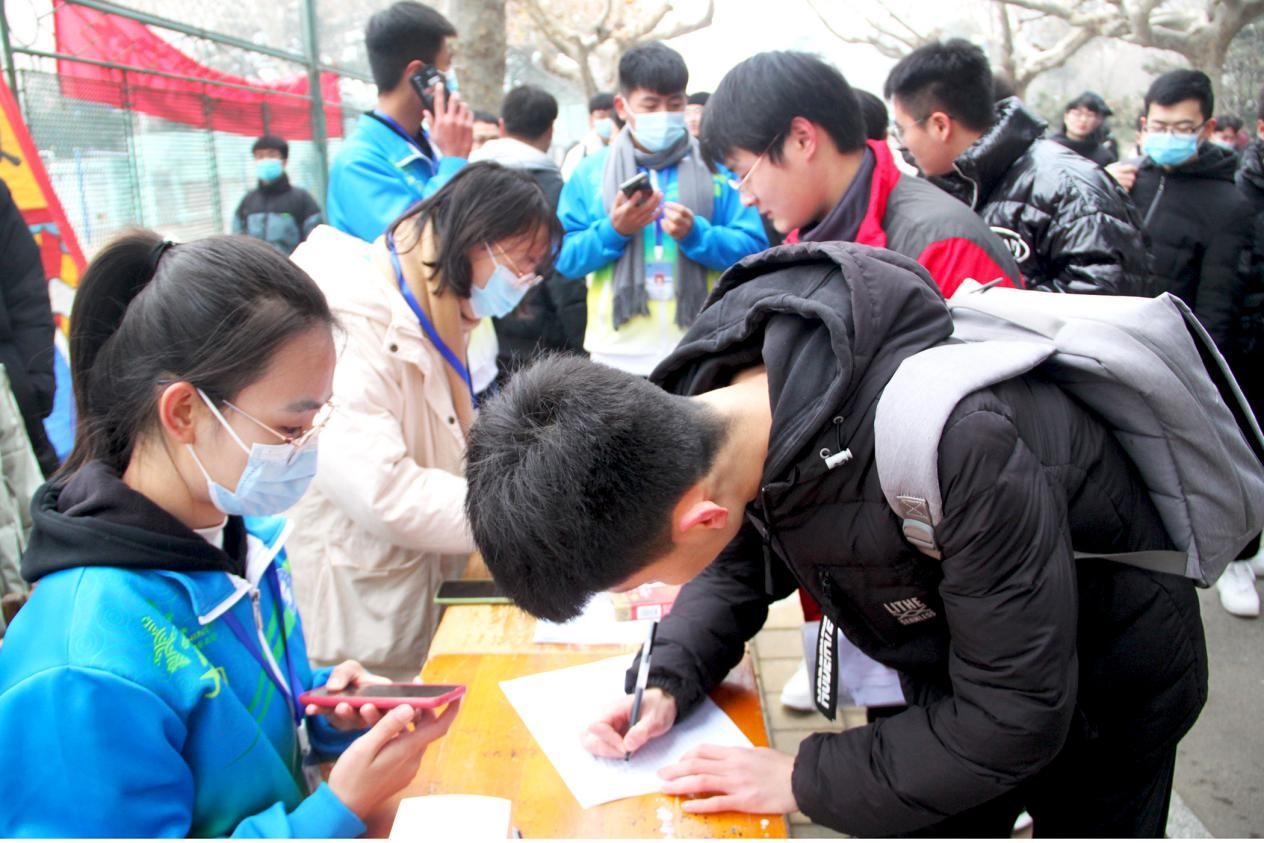 登记处前,等待领取物品的同学排起了长队。“登记后记得归还物品哦。”工作人员柔声说道。