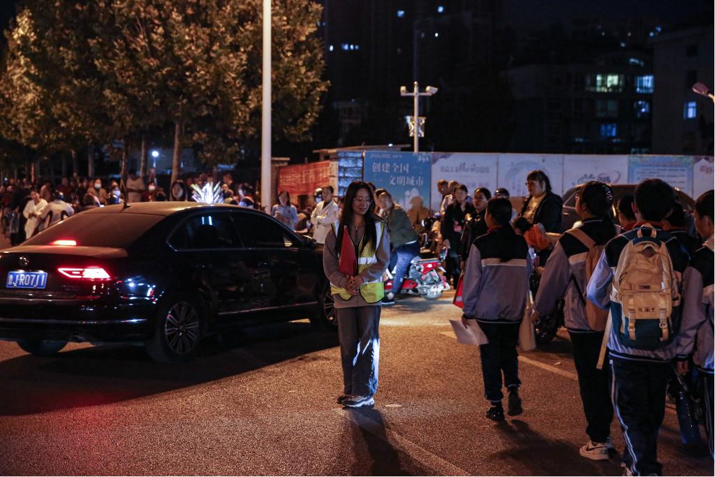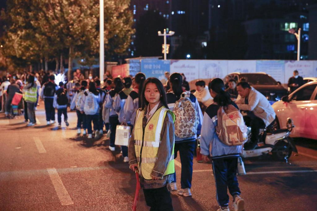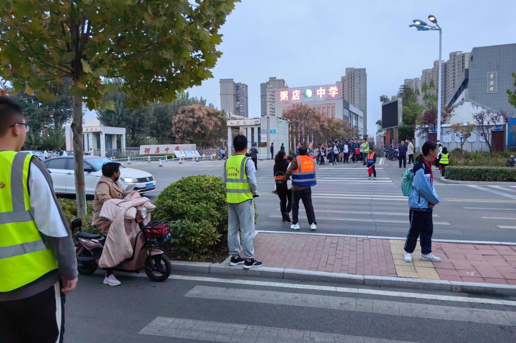 放学时段,志愿者引导车辆避让员工。