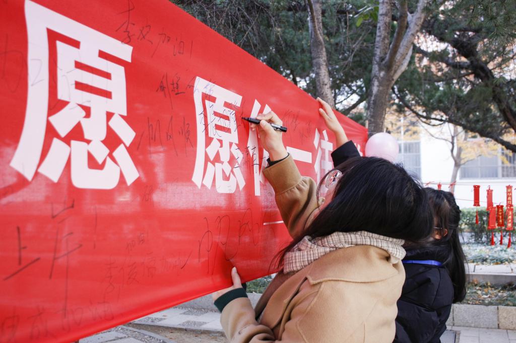 条幅满载真情,愿每一个考研学子乘风破浪、披荆斩棘,守得云开见月明,直挂云帆济沧海!(文:许浩然 图:陈树鹏 鲁俊洋)