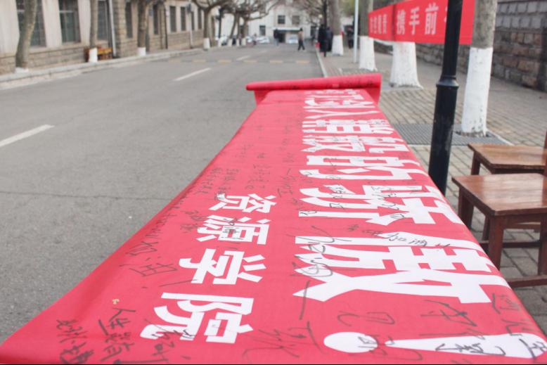学弟学妹汇聚在横幅前,找一处最亮眼的地方,写下心中最真挚的祝福。考研这件事,我们都在为你助力。