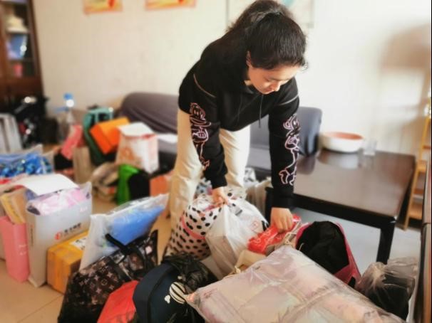 图为张佳丽同学在整理爱心物品