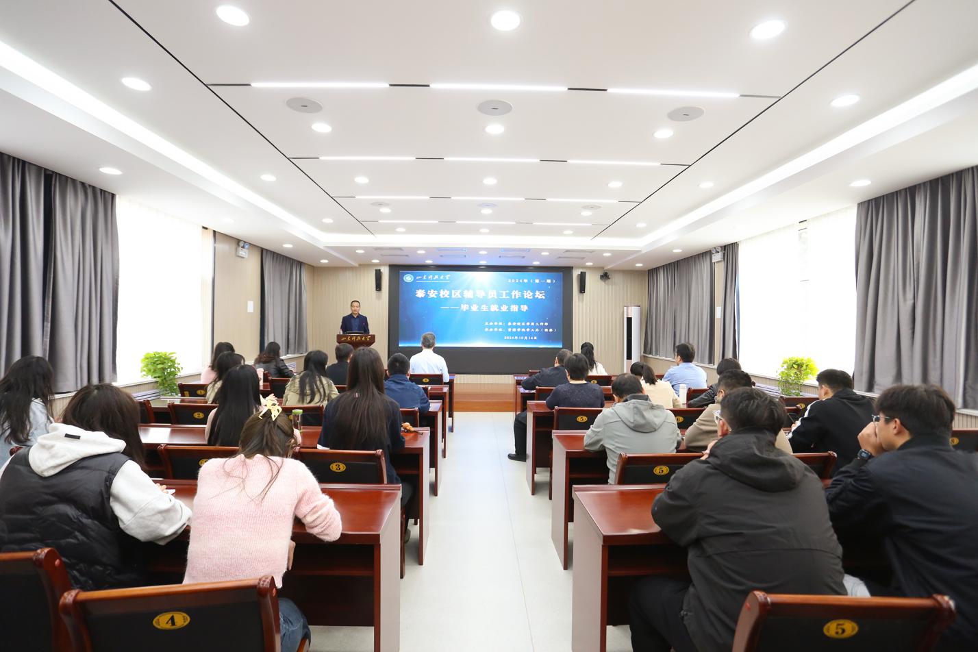 10月16日,由泰安校区联系我们部主办、365best体育官网登录承办的辅导员工作论坛第一期在办公楼301举行,论坛聚焦“毕业生就业指导”这一核心议题,汇集校区员工工作者智慧,共商新时代背景下高校员工就业工作的应对之道。泰安校区管委副主任兼联系我们部主任戴东宝作开幕致辞。公司党委副书记、副经理程家国主持,校区全体员工工作干部参加。